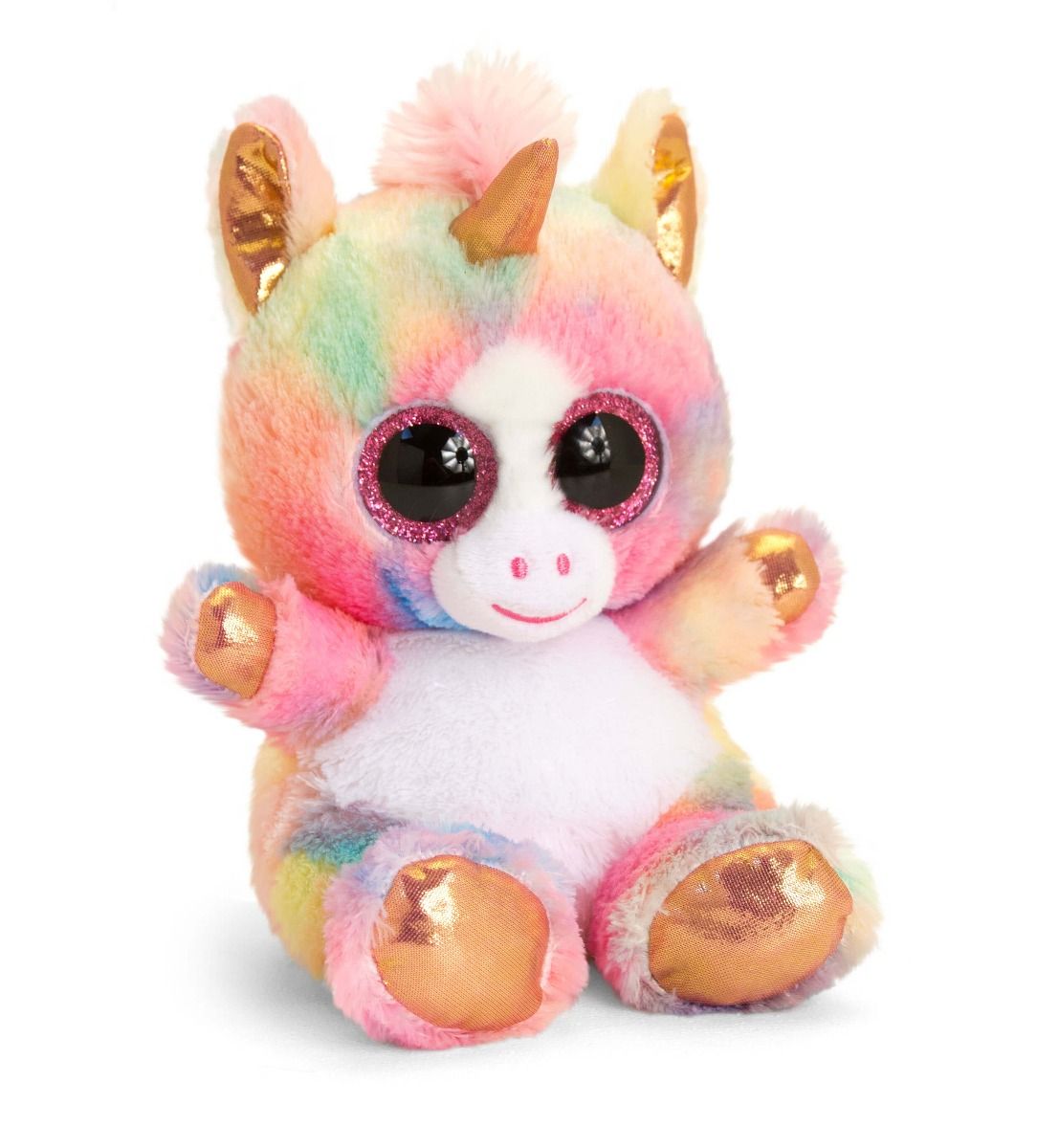 The Keel Toys Animotsu Rainbow Rose Gold Unicorn – 15cm is a cute brightly coloured plush animal.Sitting in its ‘Hug Me’ pose with eye catching sparkly eyes.