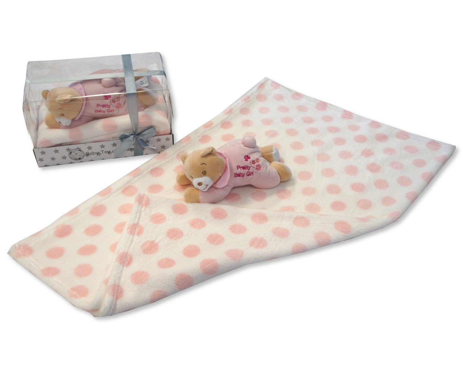 Gorgeous Gift Set For Baby. Includes a super cuddly Teddy With Blanket. Cute teddy has embroidered ' Pretty Baby Girl'. Size of Teddy is 24cm Approx. Superior Quality, Warm Supersoft & Comfortable! Blanket Suitable for
