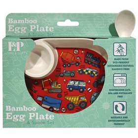 This feeding set contains an egg plate and spoon set in a vehicles pattern.