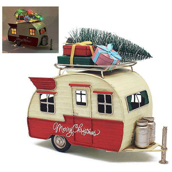 A retro style metal caravan with warm LED lights and a lit Christmas tree.