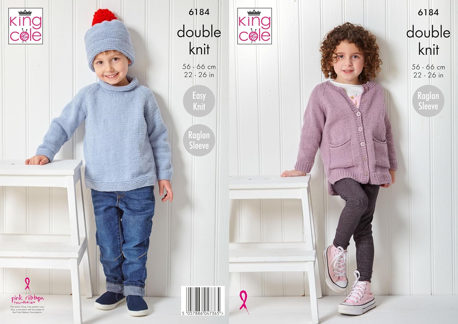 King Cole Children's Easy Knitting Pattern, Raglan Sleeve, Double Knit Sweater, Cardigan and Hat (6184), 22” – 26” (56cm – 66cm)