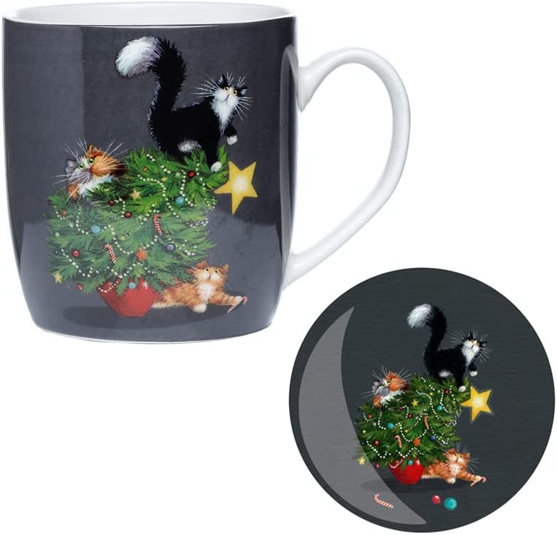 Puckator XMUGC24 Kim Haskins Christmas Tree Catastrophe Cats Porcelain Mug and Coaster Set