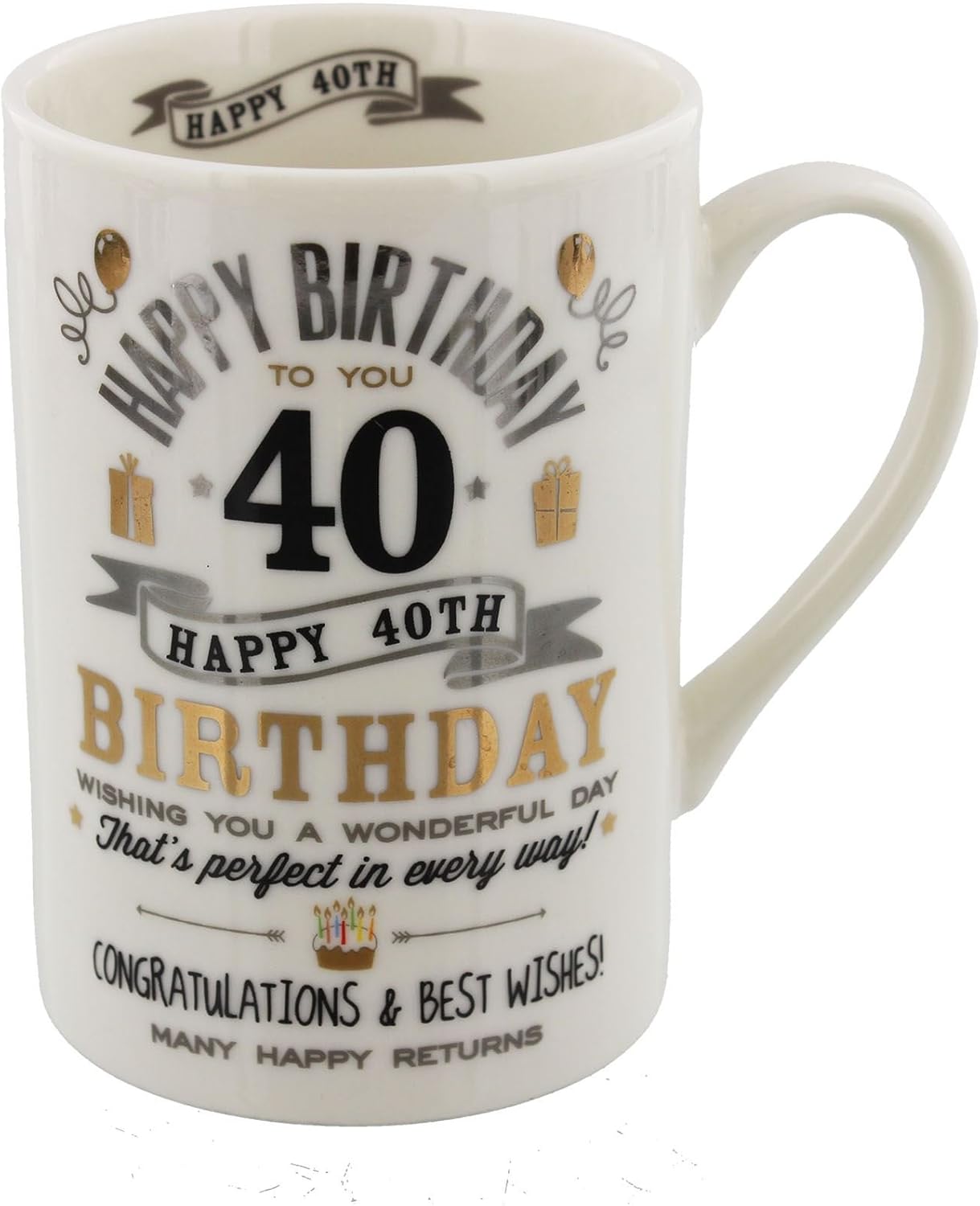 A Signography by Juliana 40th birthday mug. This striking 40th birthday mug has a stylish silver and gold design adorned with images of a birthday cake, presents and balloons. The mug makes for a great gift to celebrate this important milestone and it comes in high quality, eye catching display packaging.