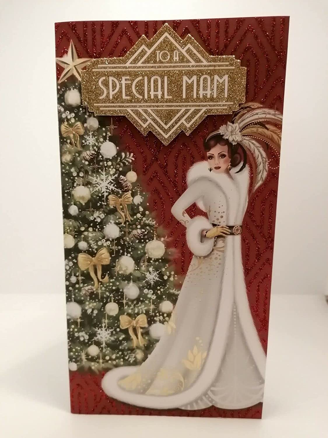 Special MAM Christmas Card Art Deco Lady Red Glitter Xmas Card