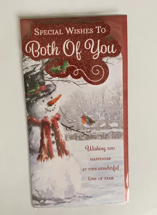 Special Wishes To Both Of You - 3D Christmas greeting Card. Comes individually wrapped in cellophane and matching red envelope. Highlighted with red foiled writing and red glitter. Full coloured matching insert. Please see photos.