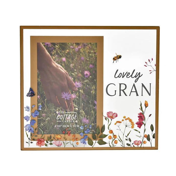 The Cottage Garden "Gran" 4 x 6 Glass Frame This magnificently presented frame is covered in unique touches which are sure to bring a smile to the face of a much-loved grandmother. The glass, freestanding frame features beautifully painted wildflowers around its portrait aperture, complete with ‘Lovely Gran’ decal. It is finished with complementary gold coloured edging around both the outer frame and aperture. 19 h 21 w 1 d mm