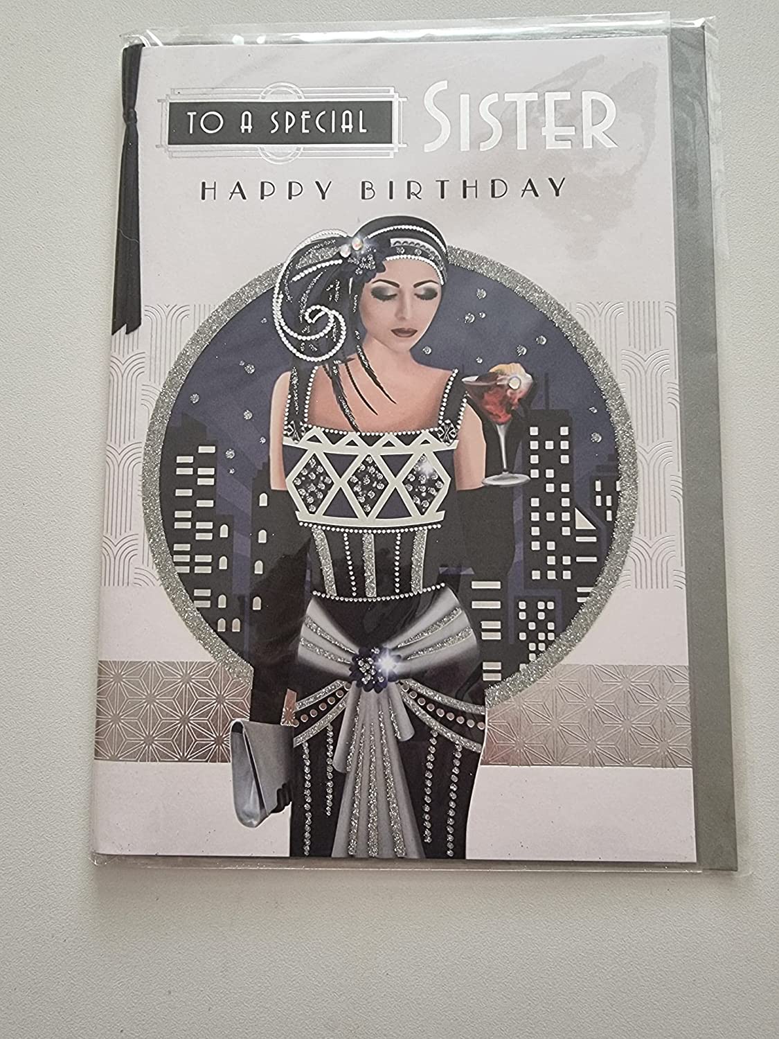 to a special sister retro happy birthday card verse its wonderful having a sister like you your kind caring and very thoughtful too so this wishes you a birthday thats happy all through with love