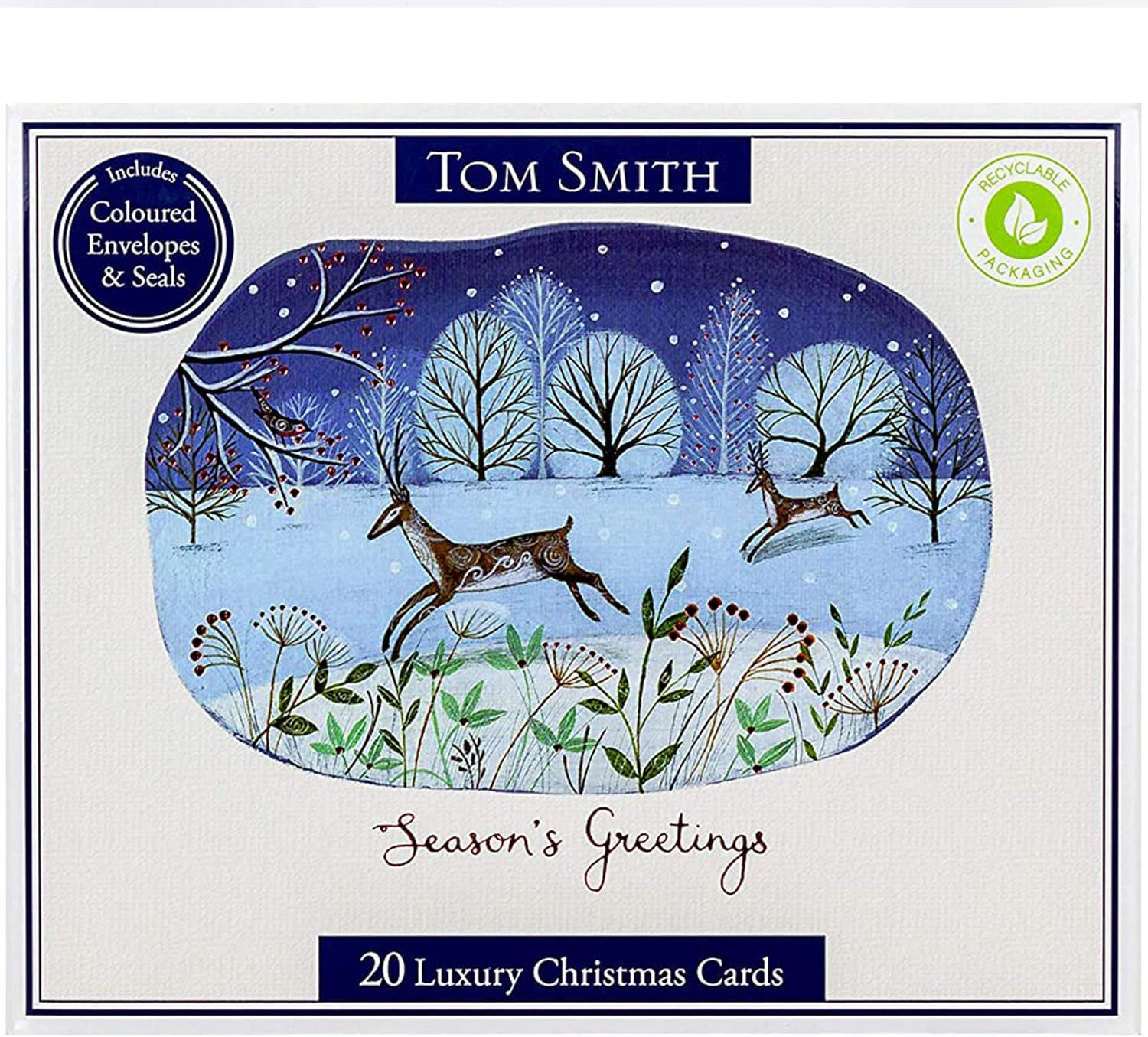 Tom Smith - Luxury Boxed Winter Scene - Christmas Cards Multipack, Traditional Winter Scene Featuring Reindeer - Christmas Card, Envelopes & Seal Sticker Set - Plastic Free Card Box With 20 Cards