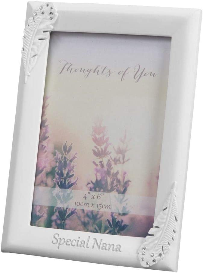 A beautiful cream crystal embellished angel feather photo frame to remember a beloved Nana. Complete with 4'x6' aperture grey fabric wrapped standing strut and pastel grey relief lettering.