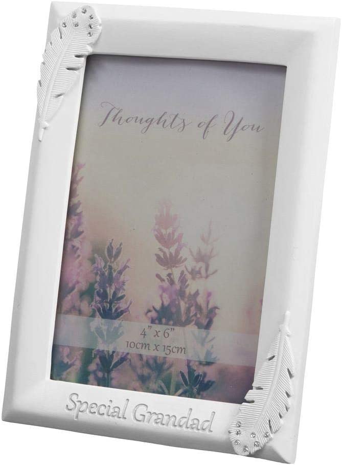 A beautiful cream crystal embellished angel feather photo frame to remember a beloved Grandad. Complete with 4'x6' aperture grey fabric wrapped standing strut and pastel grey relief lettering.